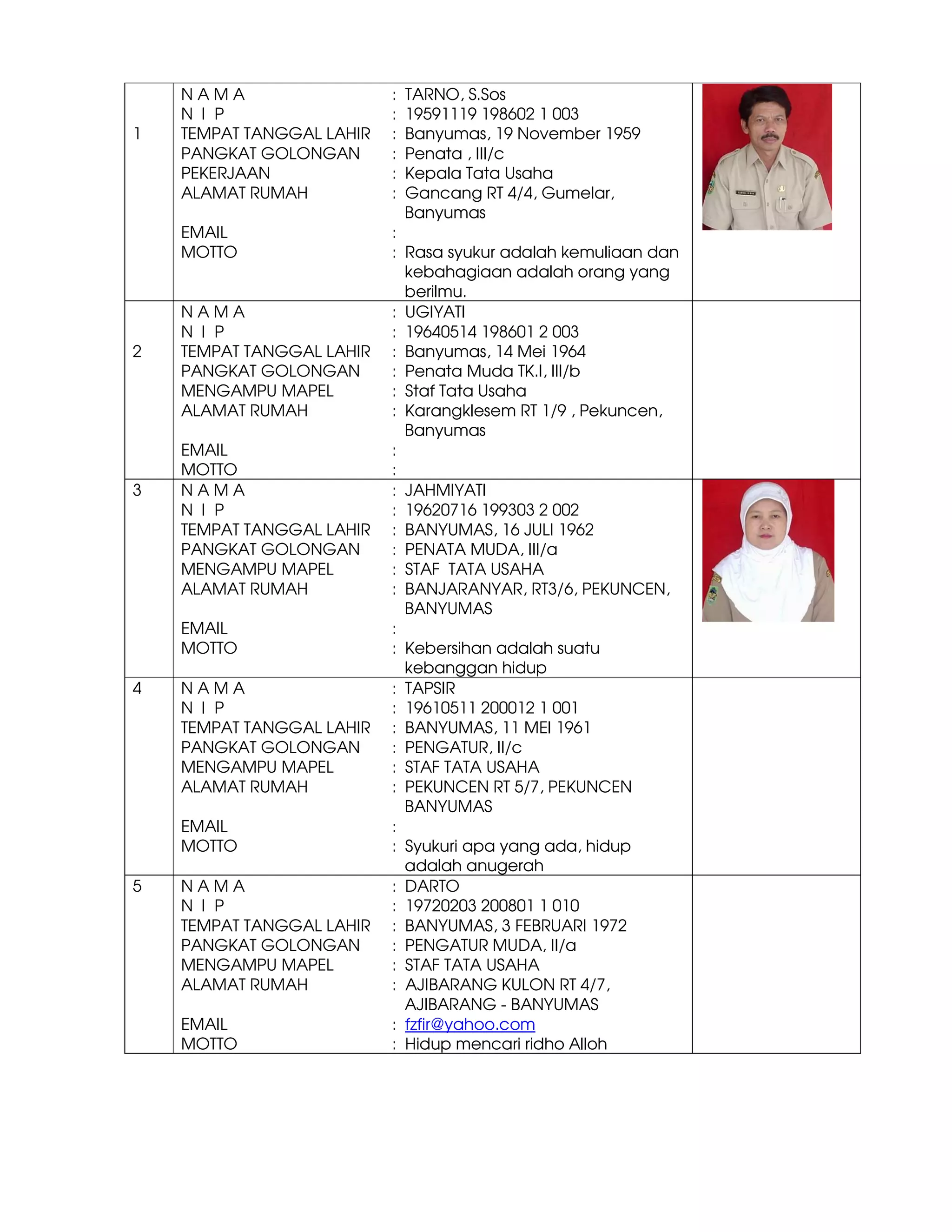 Dokumen ini mengandungi maklumat tentang beberapa individu termasuk nama, NIP, tempat tanggal lahir, pangkat golongan, pekerjaan, alamat, dan motto masing-masing. Semua individu tersebut lahir di Banyumas dan memiliki pekerjaan dalam bidang tata usaha dan penjagaan sekolah. Setiap individu juga mempunyai motto yang menggambarkan prinsip atau nilai yang mereka pegang.