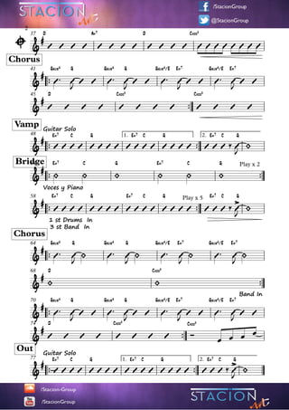 This document contains musical notation for a song including chord progressions, time signatures, lyrics, and instructions for different instruments and vocals. It outlines the song structure with an introduction, verses, choruses, guitar solos, bridges and includes notation for the guitar, piano, vocals and full band instrumentation. The notation provides the framework to perform this worship song.