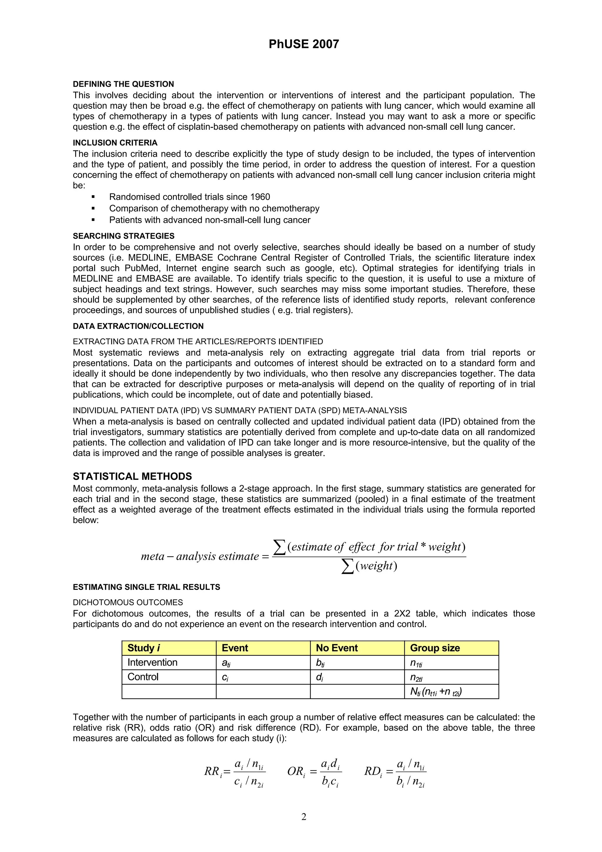 This document provides an overview of meta-analysis and summarizes its key aspects and statistical methods. It discusses how meta-analysis can combine results from multiple studies to obtain a single estimate of treatment effect. It also summarizes the steps involved in planning and conducting a meta-analysis, including defining the question, inclusion criteria, searching strategies, and statistical methods for analyzing different types of outcomes. Finally, it reviews several software options available for performing meta-analyses.