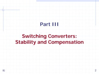 This document discusses stability and compensation techniques for switching converters. It begins by introducing feedback systems and stability criteria such as the Nyquist criterion and Bode plots. It then examines loop gain functions of different orders and their impact on stability and transient response. Several common compensation techniques are described, including type I, II, and III compensators. The document concludes by discussing stability evaluation based on line and load transients and current mode pulse width modulation with compensation ramps.