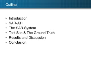 1. The document describes using Ku-band SAR along-track interferometry (ATI) to measure sea surface currents from an airborne SAR system. 2. Flight tests were conducted over Asahi Reef in Japan, where tidal currents ranged from 0.7-0.9 m/s. 3. Analysis of perpendicular flight lines using ATI yielded a two-dimensional surface current map with velocities matching ground truths of 0.7-0.9 m/s within 10m resolution cells.