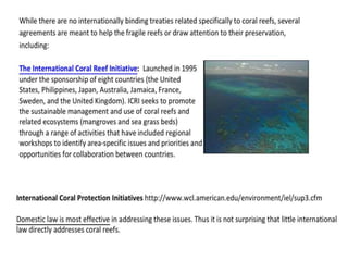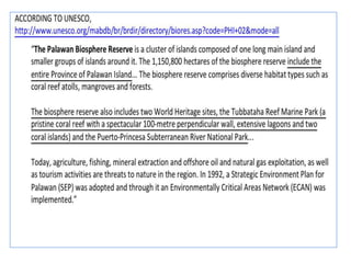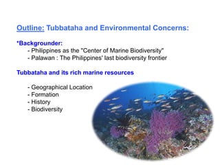 The document provides background information on the Philippines being a center of marine biodiversity, with Palawan being its last biodiversity frontier. It then discusses Tubbataha Reefs Natural Park, located in the Sulu Sea, describing its geographical location, formation from ancient volcanic islands, and history of traditional use by local fishermen that is now protected. The biodiversity and reef systems of the Philippines are protected by international treaties.