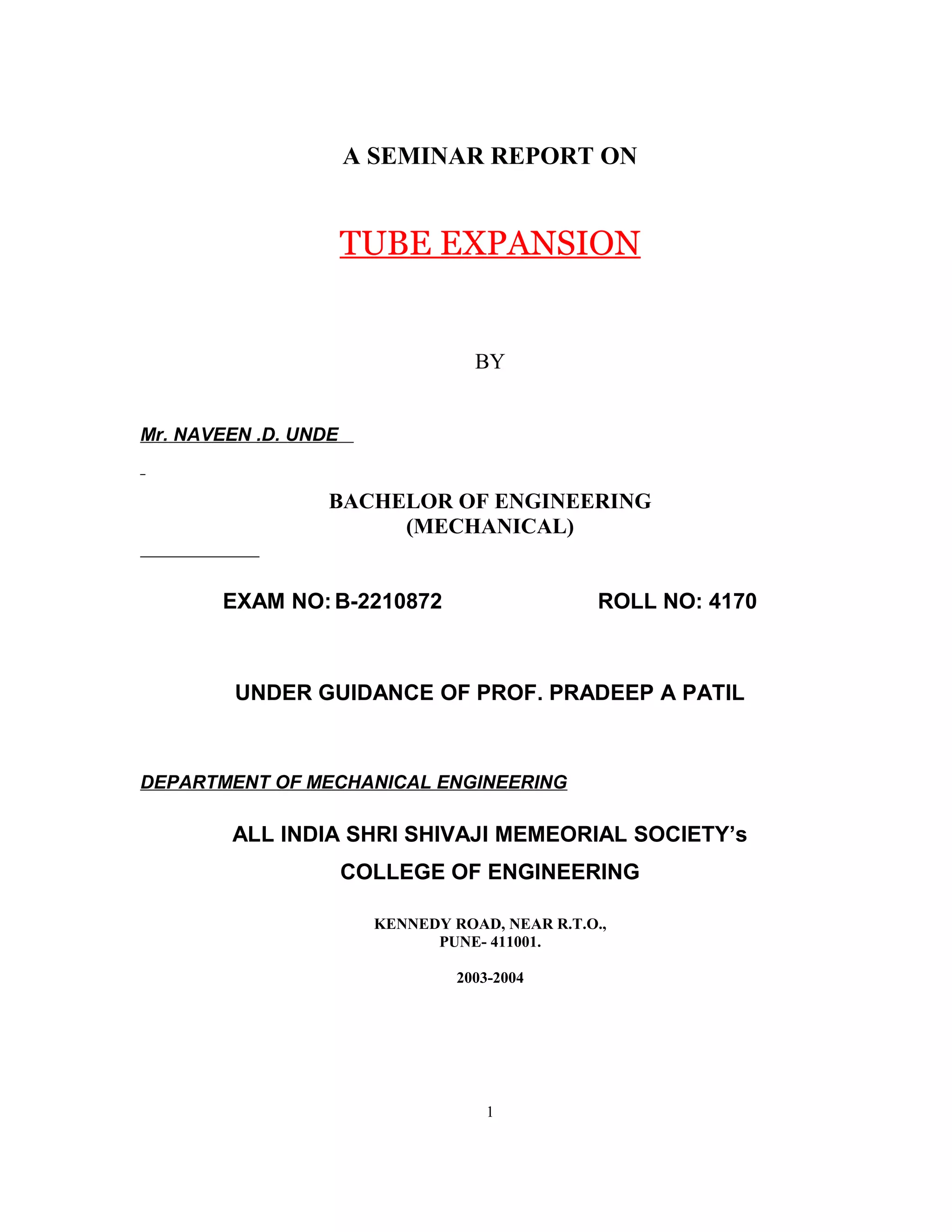 This document is a seminar report on tube expansion submitted by Mr. Naveen D. Unde. It discusses various aspects of tube expansion including definitions, tube sheet preparation, expansion procedures and limits, tips for good expansion, tube expanders and pullers, and tube removal. The report provides information on tube expansion techniques for applications such as heat exchangers and generators.