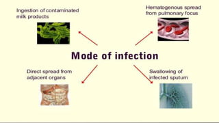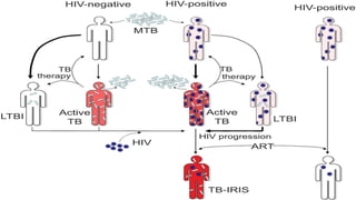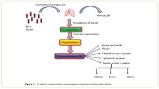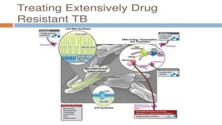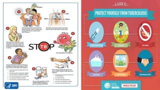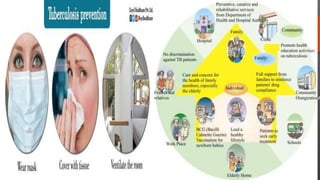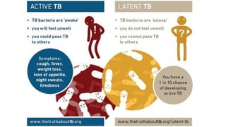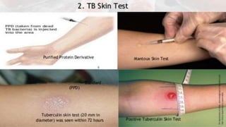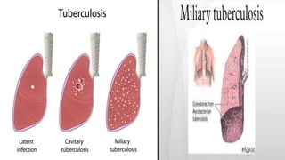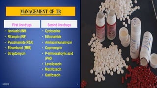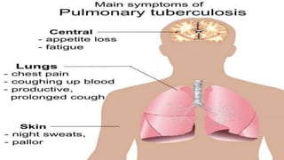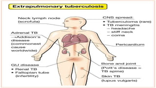This document provides an overview of tuberculosis (TB) including its definition, causes, symptoms, types, diagnosis and treatments. Key points include: