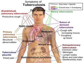 Tuberculosis (TB) is a serious infectious disease primarily caused by Mycobacterium tuberculosis, affecting mainly the lungs but can spread to other areas. Approximately 1/2 of the global population is infected, with high prevalence in developing countries, and typical symptoms include a chronic cough, fever, night sweats, and weight loss. Treatment involves a combination of first-line and second-line drugs, with a focus on standardized, supervised approaches to ensure adherence and curtail drug resistance.