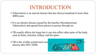 Tuberculosis is a chronic infectious disease caused by the bacterium Mycobacterium tuberculosis that primarily affects the lungs. It spreads through the air and is one of the top infectious killers worldwide. Those at highest risk include those with weakened immune systems, living in areas with high TB rates, abusing alcohol or tobacco, or living with an infected individual. The bacteria are inhaled, travel to the lungs, and can spread throughout the body. Most infections remain latent without symptoms, but active disease can cause coughing, weight loss, fever and other signs. Diagnosis involves sputum tests, chest imaging and tuberculin skin tests. Treatment requires multiple antibiotic drugs over several months to prevent drug resistance. New vaccines and drug