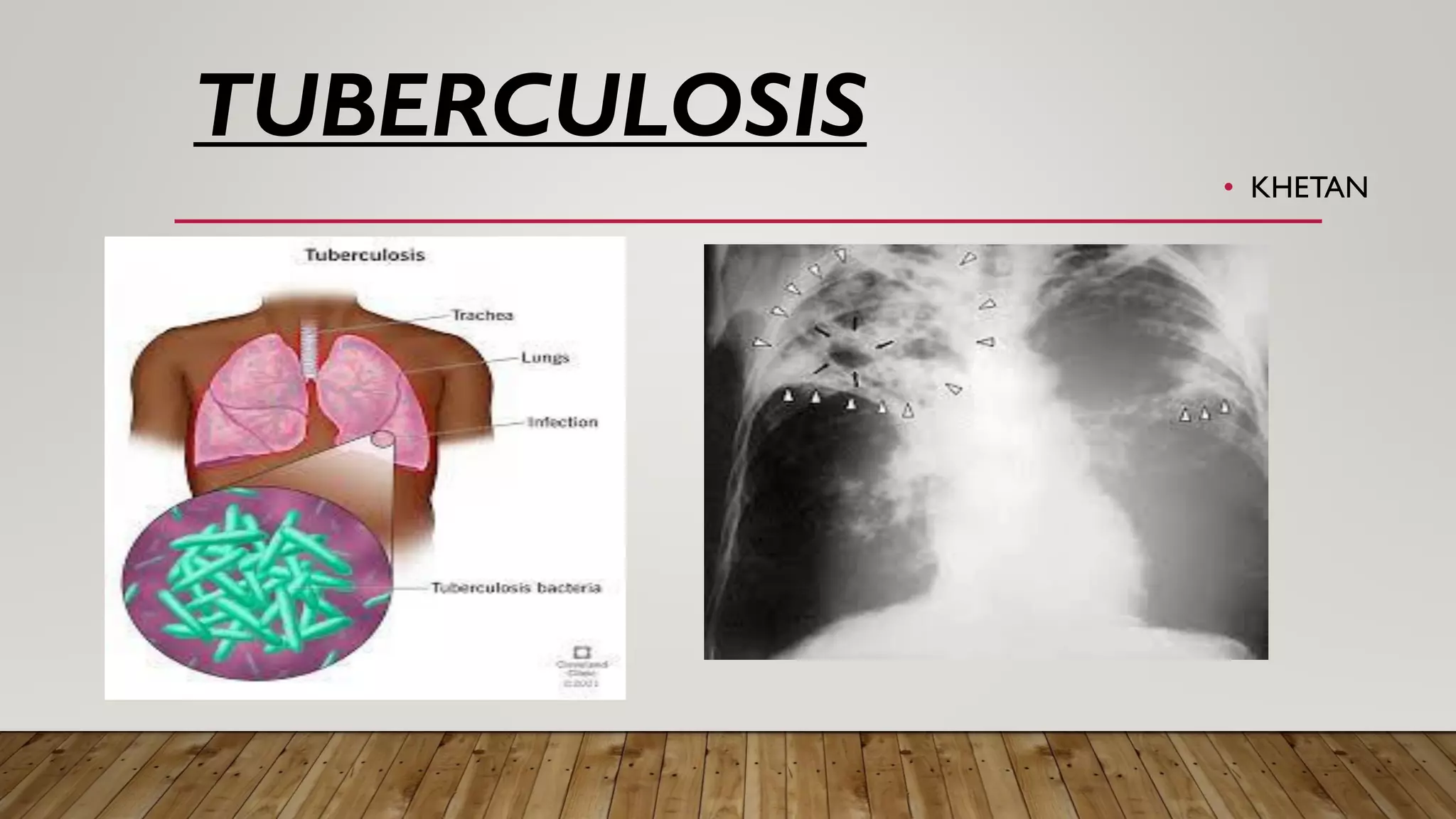 Tuberculosis is an infectious disease that mainly affects the lungs and is caused by the Mycobacterium tuberculosis bacteria. It spreads through tiny droplets released into the air via coughs and sneezes. Common symptoms include coughing for more than three weeks, coughing up blood or mucus, chest pain, unintentional weight loss, fever, and night sweats. Diagnosis involves skin tests, blood tests, chest x-rays, and sputum samples. Treatment requires taking combinations of antibiotics for several months. Complications can include spinal pain, joint damage, meningitis, and liver or kidney problems.