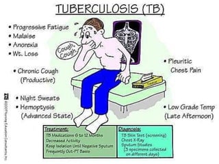 This document discusses tuberculosis (TB), including relevant physical examination findings, diagnostic tests, and treatment. On physical examination, abnormal breath sounds and dullness on percussion over the upper lobes may be present. Diagnostic tests include blood tests to rule out other diseases, sputum culture and staining to identify the bacteria, chest x-ray showing consolidations or effusions, and biopsy for histological examination. Treatment involves a multi-drug antibiotic regimen under directly observed therapy to ensure adherence and prevent resistance. Education on proper hygiene and completing the full treatment course is also important.