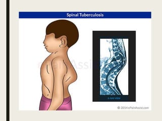 This document discusses tuberculosis (TB), caused by the bacterium Mycobacterium tuberculosis. It spreads through the air and affects the lungs and other organs. Poverty, malnutrition and overcrowding increase the risk. Primary TB occurs via inhaled bacteria forming lesions, while secondary TB results from reactivation of dormant bacteria. Symptoms include cough, fever and weight loss. Diagnosis involves staining samples to identify bacteria and culturing sputum. Treatment requires long-term antibiotic therapy.