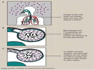 Tuberculosis is a worldwide public health problem caused by the bacterium Mycobacterium tuberculosis. It primarily affects the lungs but can spread to other organs. Major risk factors include close contact with an active case, immunocompromised status, and living in crowded conditions. TB progresses through primary, latent, and active stages. Treatment involves a multi-drug regimen administered under direct observation for 6-12 months. Complications may include spread to other organs. Nursing care focuses on airway clearance, treatment adherence, nutrition, and preventing spread.