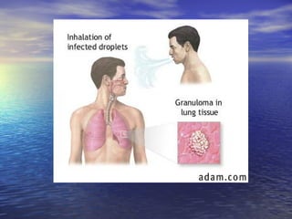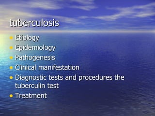 Tuberculosis is caused by the bacterium Mycobacterium tuberculosis. It affects many parts of the body and has a variable clinical presentation ranging from no symptoms to severe symptoms like fever, cough, and weight loss. Diagnosis involves tests like the tuberculin skin test and imaging tests. Treatment requires a long course of multiple anti-tuberculosis medications.