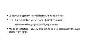 Tuberculous cervical lymphadenitis is caused by Mycobacterium tuberculosis infection of the cervical lymph nodes, usually through the tonsils. Clinically, it presents with fever, cough, and swollen lymph nodes in the neck. Left untreated, the infection can progress from a non-tender cold abscess to a collar stud abscess under the skin that ruptures, forming draining sinus tracts. Diagnosis involves aspiration or biopsy of lesions for staining, culture and cytology. Treatment consists of a 6-9 month course of anti-tuberculosis drugs. Aspiration or incision and drainage may be used for abscesses. Surgery is indicated for drug-resistant cases or persistent sinuses.