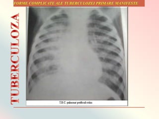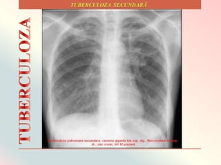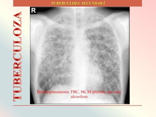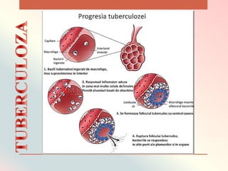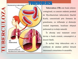 Tuberculoza este o boală infecțioasă endemică cauzată de Mycobacterium tuberculosis, care afectează în principal plămânii și poate deveni cronică și fatală fără tratament. Detectarea tuberculozei se face prin diverse metode, inclusiv colorarea Ziehl-Neelsen și tehnici PCR, iar boala se poate prezenta sub formă activă sau latentă, cu simptome variabile. Riscurile includ fumatul, alcoolismul și diverse comorbidități, iar evoluția este favorabilă cu un tratament adecvat.