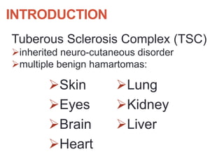 Tuberous sclerosis complex (TSC) is an inherited neurocutaneous disorder caused by mutations in either the TSC1 or TSC2 gene, resulting in the growth of benign tumors (hamartomas) in multiple organs. Major features include facial angiofibromas, hypomelanotic macules, shagreen patches, retinal nodular hamartomas, cortical tubers, subependymal nodules, and cardiac rhabdomyomas. Common manifestations are seizures (80-90%), cognitive deficits (44-65%), renal angiomyolipomas (40-70%), and retinal hamartomas. Everolimus has been approved to treat renal angiomyolipomas and subependymal