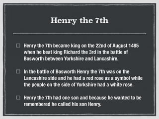 The document summarizes key Tudor kings and queens who ruled England from 1485 to 1603. Henry VII became king in 1485 after defeating Richard III at the Battle of Bosworth. Henry VIII succeeded him in 1509 and had six wives. Edward VI briefly ruled after Henry VIII but was ill, followed by Lady Jane Grey who reigned for only nine days before Mary I took the throne. Mary I, nicknamed "Bloody Mary", had many Protestants executed. Elizabeth I succeeded Mary I in 1558 and ruled until 1603, ending the Tudor dynasty. She patronized William Shakespeare during her reign.