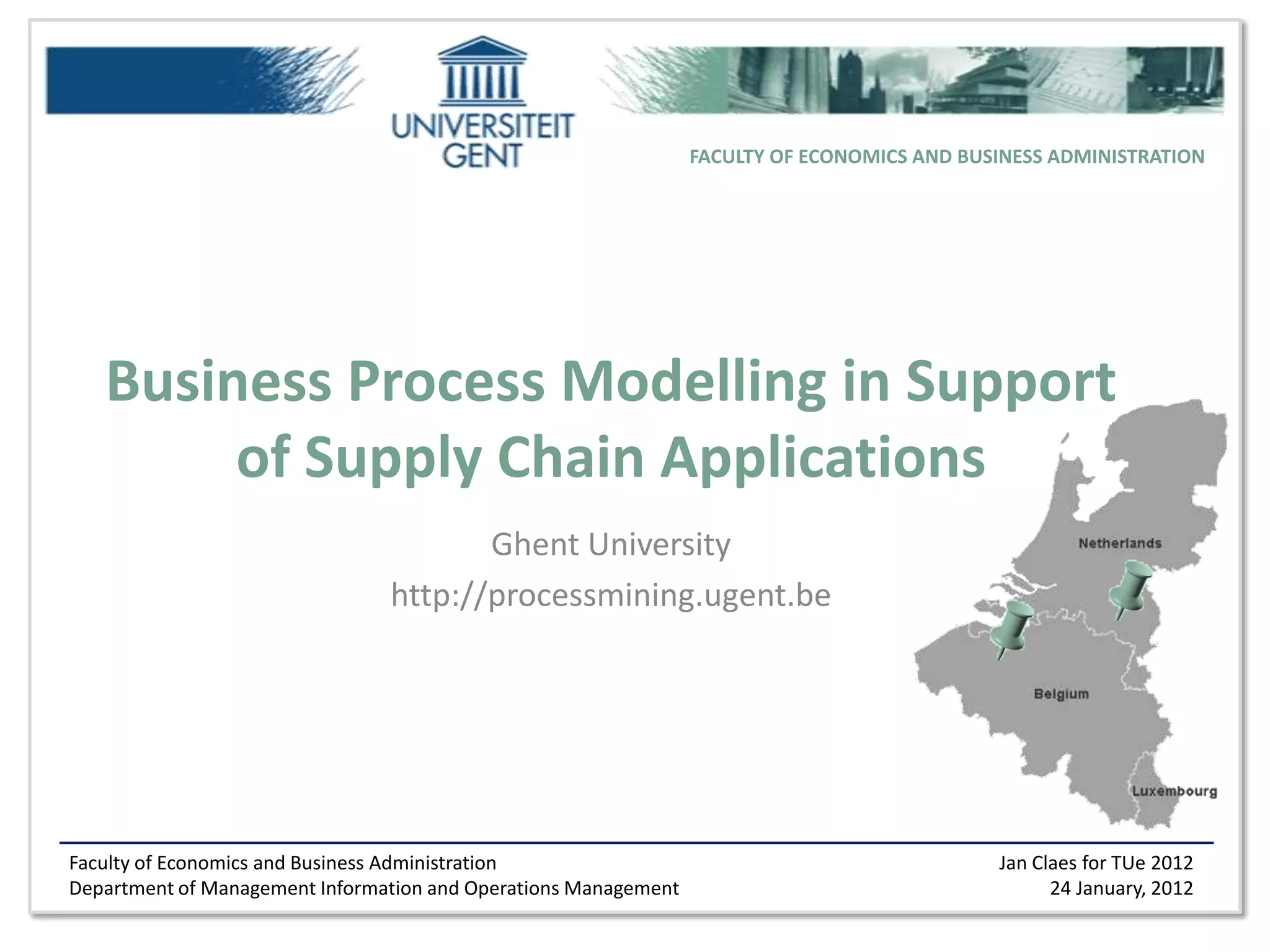 Jan Claes is a PhD student studying how to merge event logs from different sources to facilitate process mining for supply chains. His research involves developing algorithms like a genetic algorithm and artificial immune system technique. He is currently visiting another university to apply process mining to modeling experiment logs. His future work includes submitting papers on his merging techniques and improving collaborative modeling.