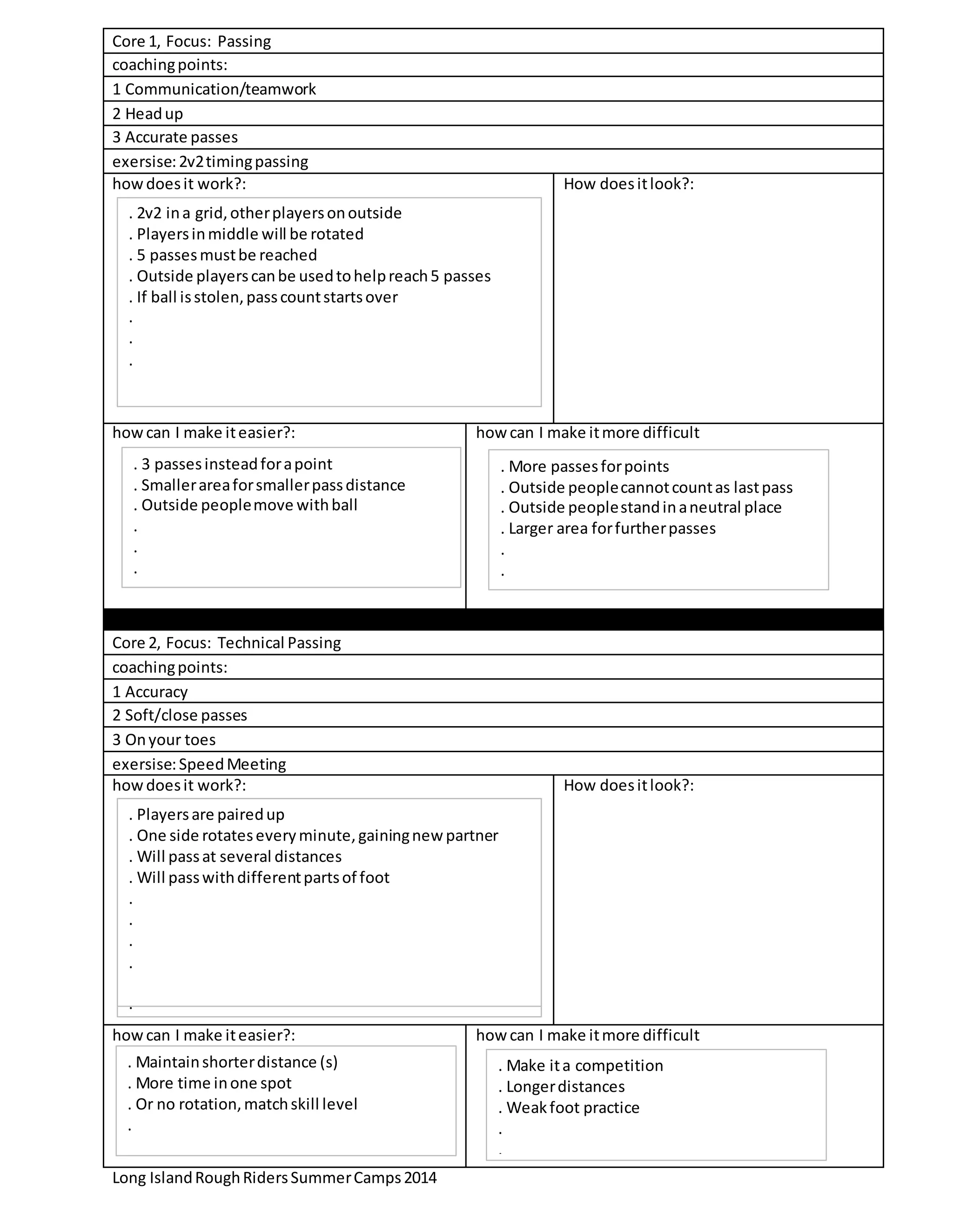 This document outlines two soccer passing drills - a 2v2 drill called "timing passing" focused on communication and teamwork, and a drill called "SpeedMeeting" focused on technical passing accuracy. It provides coaching points, descriptions of how the drills work, and suggestions for making the drills easier or more difficult for players.