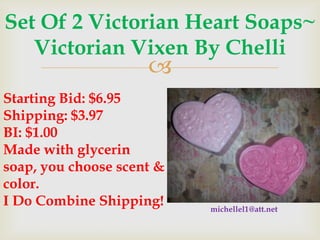 This document contains listings from three sellers for various handmade items: soaps, jewelry, and beads. Michelle is selling heart-shaped soaps and hair accessories. Roseanne offers crystal and gold jewelry. Brenda has natural stone pendants, button beads, and Tibetan silver charms. All three sellers provide details on materials, sizes, and combine shipping options for interested buyers.