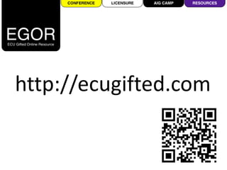 The document discusses different types of classrooms and gifted education. It compares traditional classrooms to gifted classrooms and classrooms of the future. It discusses how gifted education is different by focusing on skills like critical thinking, creativity, collaboration, communication, and citizenship. It emphasizes teaching students to think through solving real problems and answering real world problems with real world solutions using technology.