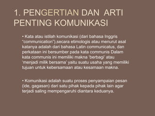 Dokumen ini menjelaskan arti penting komunikasi, yang merupakan proses penyampaian pesan antara individu dengan tujuan saling mempengaruhi. Terdapat berbagai jenis komunikasi, termasuk intrapribadi, antarpribadi, kelompok, publik, organisasi, dan massa, serta tahapan proses komunikasi yang bertujuan menciptakan pemahaman yang efektif. Selain itu, diungkapkan syarat-syarat komunikasi yang efektif dan implikasi manajerial dalam konteks organisasi.