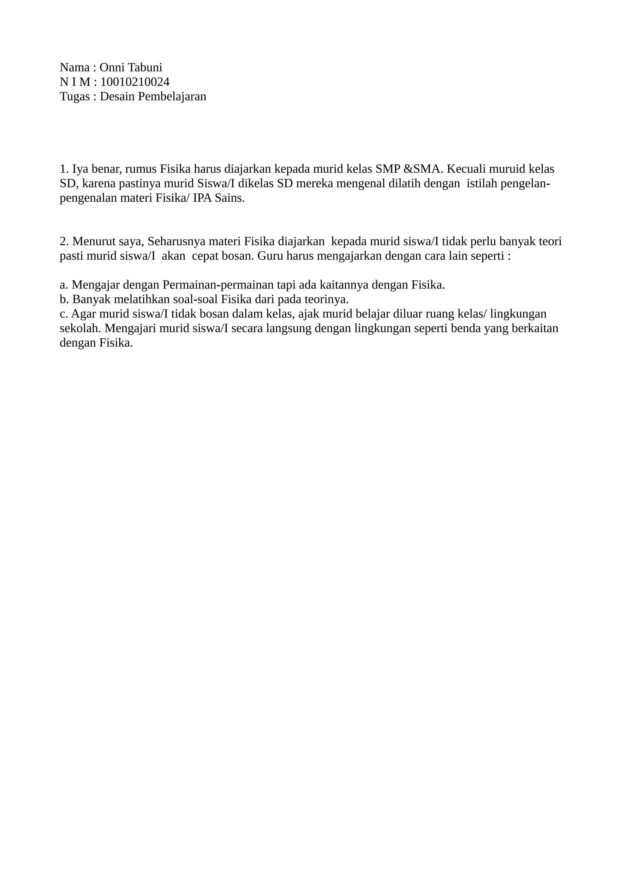 Dokumen ini membahas pentingnya pengajaran fisika di tingkat SMP dan SMA, serta memandang bahwa materi fisika bukanlah untuk siswa SD. Penulis menyarankan metode pengajaran yang lebih interaktif seperti permainan, latihan soal, dan pembelajaran di luar ruang kelas untuk menjaga minat siswa. Penekanan pada praktik langsung dengan lingkungan sekitar diharapkan dapat membuat pembelajaran fisika lebih menarik.