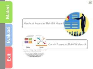 Presentasi ini memberikan tips untuk membuat presentasi yang efektif dan menarik dengan cara menyederhanakan isi slide, menggunakan gambar dan warna secara bijak, memilih huruf dan ukuran huruf yang mudah dibaca, serta konsistensi unsur-unsurnya. Contoh slide efektif juga ditunjukkan dengan menggunakan gambar, pertanyaan, dan presentasi informasi secara ringkas.