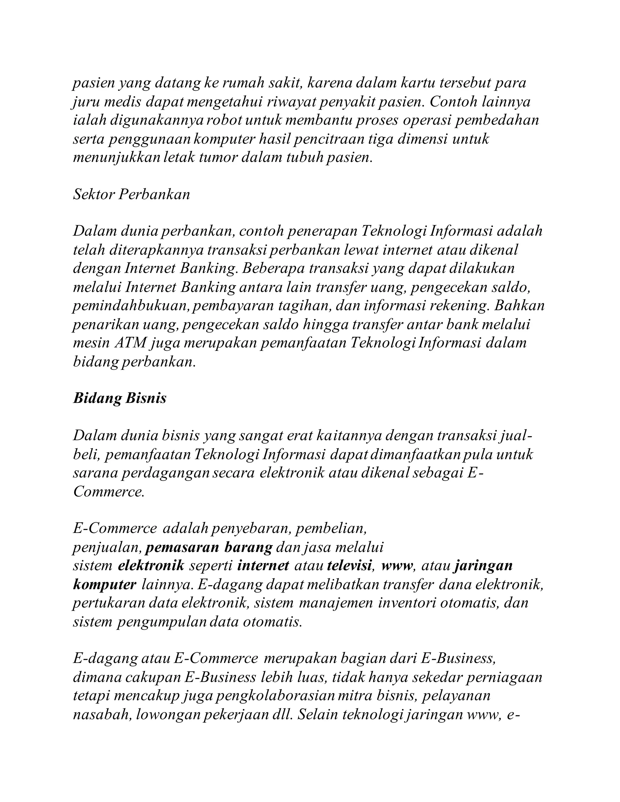 Dokumen ini menjelaskan penerapan teknologi informasi di berbagai bidang seperti pendidikan, kesehatan, perbankan, bisnis, dan industri, serta menguraikan perbedaan antara teknologi informasi dan teknologi komunikasi. Dalam pendidikan, teknologi mendukung e-learning; dalam kesehatan, sistem kartu cerdas dan robot digunakan; sementara di perbankan, transaksi internet banking berkembang. Teknologi informasi dan komunikasi saling terkait dan bersama-sama mendukung pengolahan dan penyebaran informasi efektif.