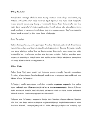 Dokumen ini menjelaskan berbagai penerapan teknologi informasi dalam bidang pendidikan, kesehatan, perbankan, bisnis, dan perusahaan. Selain itu, ia membahas perbedaan antara teknologi informasi dan teknologi komunikasi, di mana teknologi informasi berfokus pada pengelolaan informasi, sedangkan teknologi komunikasi berfokus pada transfer data. Kedua konsep ini tidak dapat dipisahkan dan terus berkembang seiring kemajuan teknologi.
