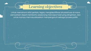 Dokumen ini membahas tentang pentingnya keterampilan ketegasan dalam mempengaruhi orang lain dan menjelaskan bahwa banyak individu, termasuk yang berada di posisi senior, mengalami kesulitan dalam menyatakan kebutuhan mereka. Keterampilan ketegasan yang efektif meliputi kemampuan untuk menyampaikan pendapat, meminta perubahan perilaku, dan menolak permintaan tanpa menimbulkan reaksi defensif. Selain itu, penekanan pada komunikasi yang jelas dan penghormatan dalam pernyataan sangat penting untuk mencapai hasil yang diinginkan dalam situasi konflik.
