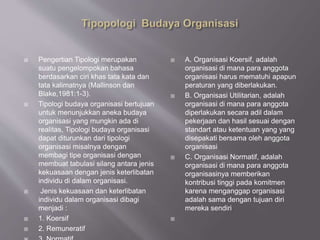 Dokumen tersebut membahas tentang pengertian dan fungsi budaya organisasi, serta tipologi budaya organisasi. Fungsi budaya organisasi menurut beberapa ahli antara lain sebagai identitas, pengikat, dan meningkatkan komitmen anggota organisasi. Tipologi budaya organisasi dapat dibedakan berdasarkan jenis kekuasaan dan keterlibatan individu dalam organisasi.