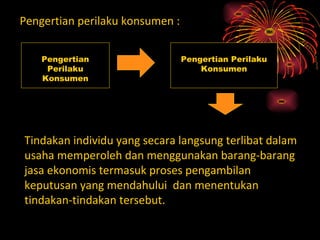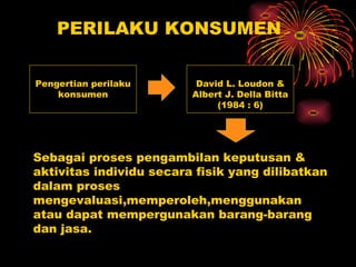 Dokumen tersebut membahas tentang pengertian perilaku konsumen menurut beberapa ahli yang didefinisikan sebagai proses pengambilan keputusan dan aktivitas fisik individu dalam memperoleh, mengevaluasi, dan menggunakan barang atau jasa serta dipengaruhi oleh lingkungan."