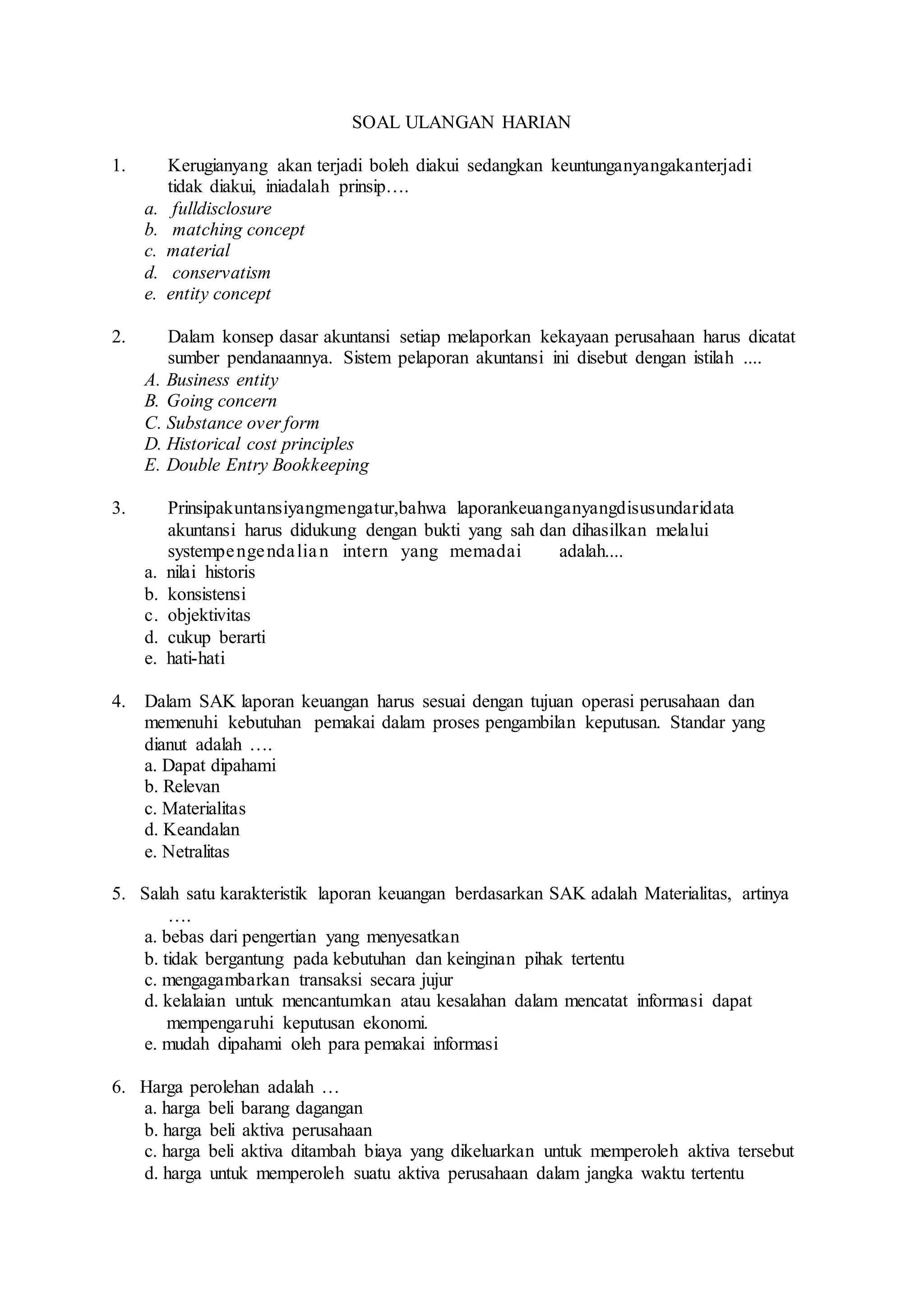 Soal ulangan harian mencakup konsep-konsep dasar akuntansi seperti konservatisme, harga perolehan, dan materialitas. Soal-soal juga membahas standar akuntansi keuangan, penyusunan laporan keuangan, dan manfaat akuntansi untuk berbagai pihak seperti investor dan bank.