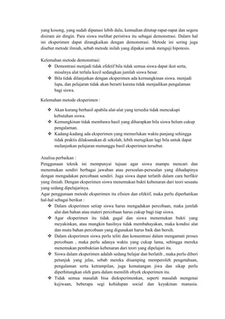 Dokumen ini membahas metode pengajaran yang digunakan dalam pembelajaran elektronik, yaitu metode demonstrasi dan eksperimen, serta analisis kekurangan dan perbaikannya. Metode demonstrasi kurang efektif jika tidak semua siswa berpartisipasi, sedangkan metode eksperimen membutuhkan alat yang memadai dan waktu yang cukup. Analisis menunjukkan pentingnya pengalaman langsung dan pengembangan kompetensi dalam proses pembelajaran.