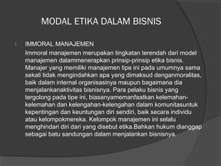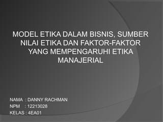 Dokumen tersebut membahas tentang model etika dalam bisnis, sumber nilai etika, dan faktor-faktor yang mempengaruhi etika manajerial. Terdapat tiga tingkatan model etika bisnis yaitu immoral, amoral, dan moral manajemen. Sumber nilai etika berasal dari agama, filsafat, budaya, dan hukum. Sedangkan faktor yang mempengaruhi etika manajerial antara lain kepemimpinan, strategi dan kinerja, karakteristik individu, serta