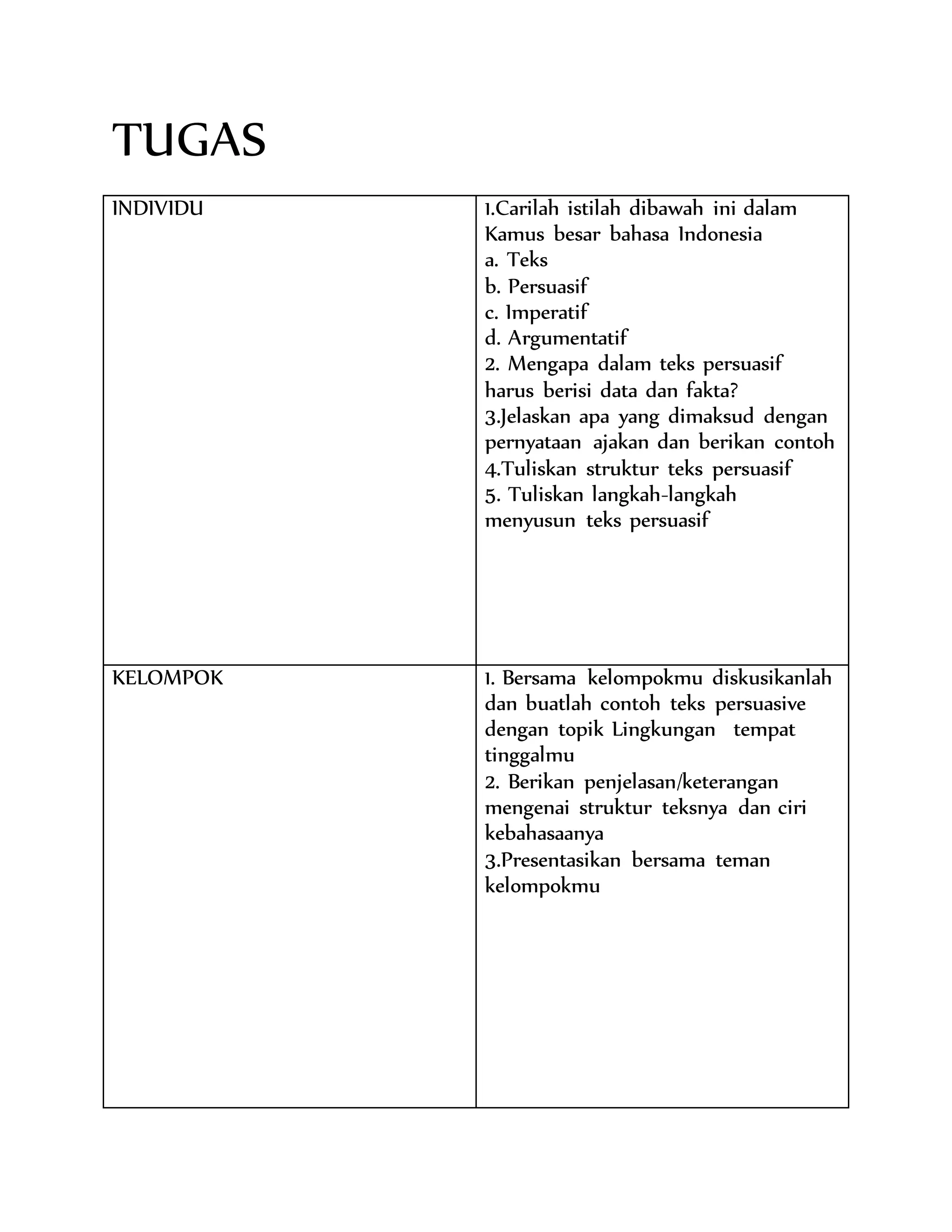 Tugas tersebut meminta siswa untuk: (1) mencari istilah-istilah dalam Kamus Besar Bahasa Indonesia, (2) menjelaskan mengapa teks persuasif harus berisi data dan fakta, (3) menjelaskan apa yang dimaksud dengan pernyataan ajakan dan memberikan contoh, (4) menuliskan struktur teks persuasif, dan (5) menuliskan langkah-langkah menyusun teks persuasif. Kelompok siswa diminta unt