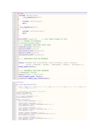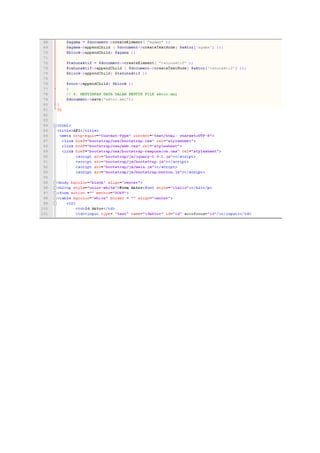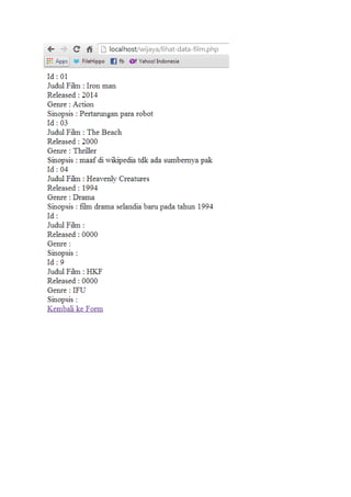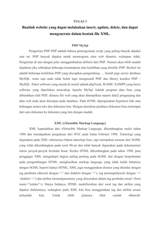 Dokumen ini membahas tentang tugas pembuatan website yang dapat melakukan insert, update, delete data, dan menghasilkan file XML. Dibahas pula pengertian PHP dan MySQL serta kelebihan XML dalam pertukaran data antar sistem. Tugas ini melibatkan pembuatan database film dan aktor, halaman utama, input data, dan file XML hasilnya.