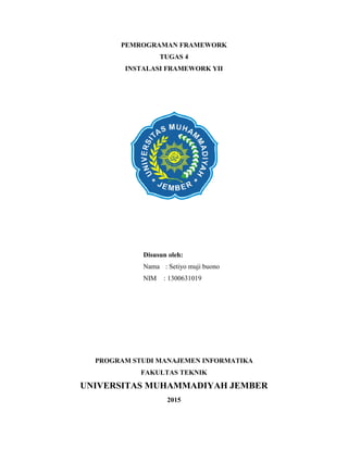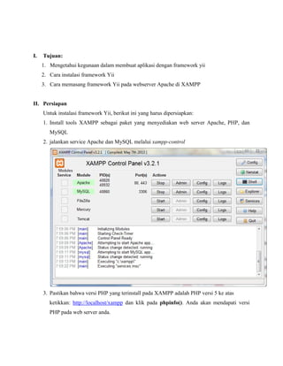 Dokumen ini membahas tentang instalasi framework Yii pada webserver Apache menggunakan XAMPP. Langkah-langkah instalasi meliputi menginstall XAMPP, menjalankan Apache dan MySQL, memastikan versi PHP, mendownload framework Yii, mengekstrak file zip ke direktori htdocs, mengakses requirements, dan menjalankan perintah untuk membuat project baru menggunakan framework Yii.