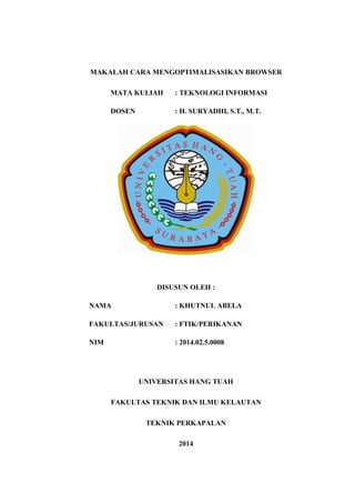 Makalah ini membahas cara mengoptimalisasi browser Mozilla Firefox dengan beberapa langkah seperti mengurangi pemakaian RAM untuk cache, mempercepat loading halaman web, memasang addons seperti Adblock Plus dan Video DownloadHelper, serta mengatur konfigurasi secara langsung di about:config untuk meningkatkan kecepatan browsing.