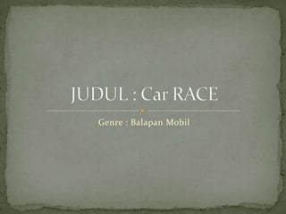 Dokumen ini menjelaskan tentang permainan balapan mobil di mana pemain berperan sebagai mobil merah yang harus mengumpulkan koin emas sambil menghindari rintangan seperti oli dan tong. Pemain akan kehilangan poin jika menabrak tong dan harus menyelesaikan balapan dengan waktu tercepat. Terdapat fitur seperti splash screen dan pengaturan latar belakang untuk menu utama.