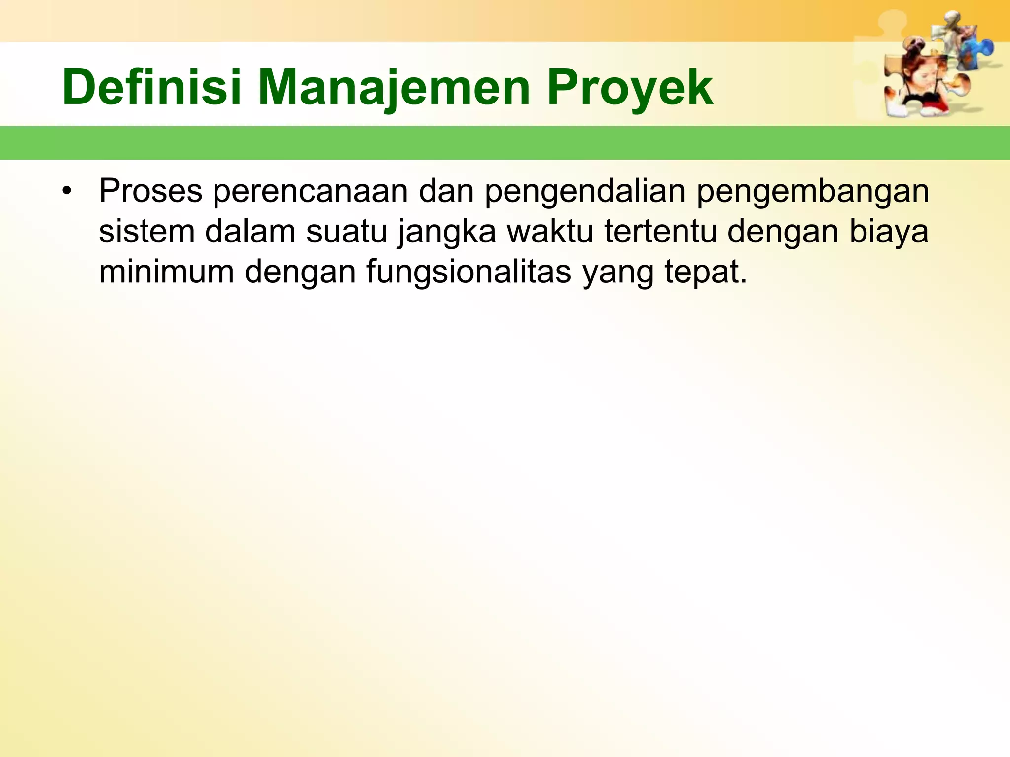 Dokumen ini membahas manajemen proyek teknologi informasi dengan fokus pada definisi, keuntungan, atribut, karakteristik, dan kendala proyek TI. Proyek TI sering mengalami kegagalan dari sisi tujuan, biaya, atau waktu, sehingga penting untuk melakukan perencanaan yang realistis dan pengelolaan yang baik. Manajer proyek diharapkan memiliki keterampilan kepemimpinan, organisasi, komunikasi, dan membangun tim untuk memastikan kesuksesan proyek.