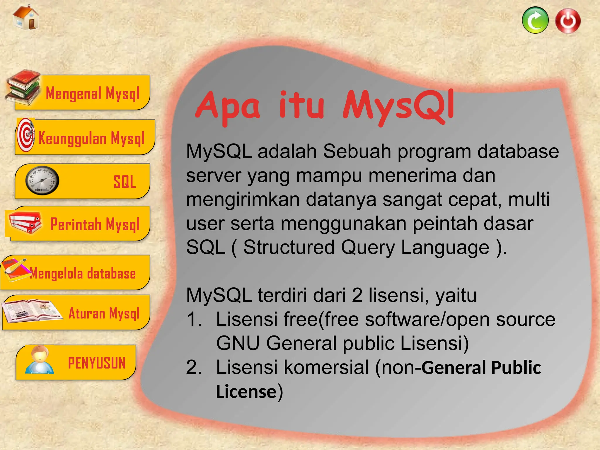 MySQL adalah program database server yang cepat dan multi-user, menggunakan perintah SQL untuk mengelola database. Keunggulan MySQL meliputi kecepatan, keamanan, dan kemampuannya memproses data dalam jumlah besar dengan biaya rendah. Dokumen ini juga menjelaskan perintah dan aturan dasar dari MySQL serta bahasa pemrograman SQL.