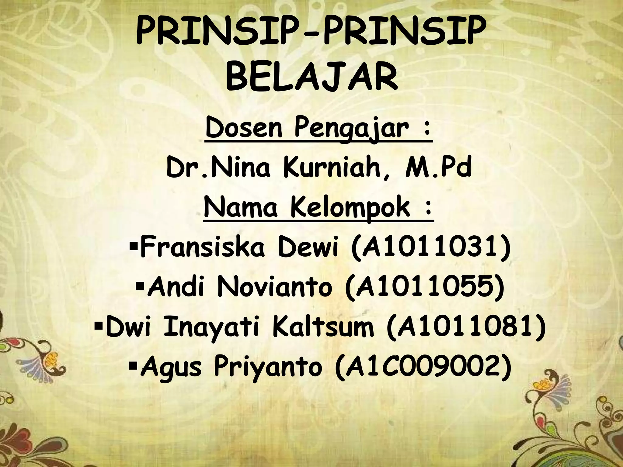 Dokumen ini membahas prinsip-prinsip belajar yang penting untuk merencanakan dan melaksanakan pembelajaran secara efektif, dengan menekankan peran siswa dan guru. Prinsip-prinsip tersebut meliputi perhatian dan motivasi, keaktifan, keterlibatan langsung, pengulangan, balikan, tantangan, dan perbedaan individu. Setiap prinsip memiliki implikasi yang signifikan dalam proses pembelajaran yang harus dipahami dan diterapkan oleh guru untuk meningkatkan hasil belajar siswa.