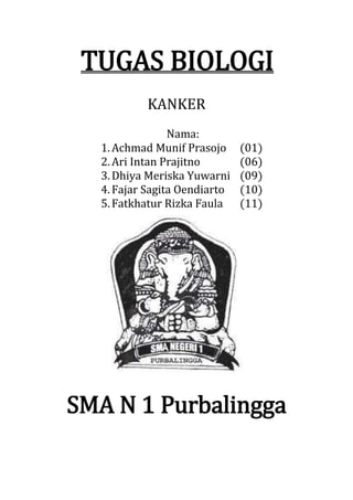 Dokumen tersebut membahas tentang tugas biologi mengenai penyakit kanker. Kanker adalah penyakit yang ditandai dengan pertumbuhan sel yang tidak terkendali yang dapat menyerang jaringan lain. Dokumen ini menjelaskan berbagai jenis kanker seperti kanker serviks, payudara, hati, dan paru-paru serta faktor-faktor penyebab dan gejala kanker.