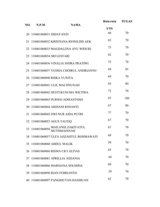This document contains the results of the midterm exam for Algebra Structures class A, including the student ID numbers, names, average midterm scores, and assignment scores for 42 students. The average midterm score ranged from 43 to 97. Most students scored between 60-80 and received 70 points on their assignment. The highest midterm score was 97 and the lowest was 43.