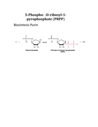 Makalah ini membahas tentang metabolisme purin dan pirimidin. Purin dan pirimidin merupakan komponen utama DNA, RNA, dan koenzim. Metabolisme purin dan pirimidin melibatkan sintesis, katabolisme, dan peran mereka dalam pembentukan asam nukleat serta penyakit seperti gout.