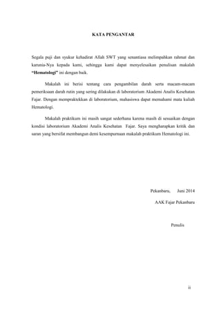 Dokumen tersebut merupakan makalah hematologi yang membahas tentang cara pengambilan darah vena dan kapiler, cara memperoleh plasma dan serum, pemeriksaan kadar hemoglobin, dan hitung jumlah leukosit.