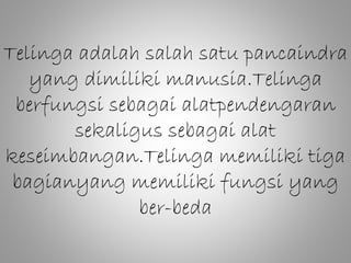 Dokumen ini membahas tentang indera pendengaran dan keseimbangan. Terdiri dari tiga bagian utama telinga yaitu bagian luar, tengah, dan dalam, yang masing-masing memiliki struktur dan fungsi tertentu dalam proses pendengaran dan pengendalian keseimbangan tubuh. Juga dijelaskan mekanisme kerja pendengaran dan alat keseimbangan yang terdapat di dalam telinga.