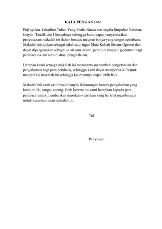 Makalah ini disusun oleh kelompok mahasiswa sebagai tugas mata kuliah sistem operasi. Penulis mengakui masih ada kekurangan dalam makalah ini dan berharap dapat memberikan manfaat sebagai acuan bagi pembaca. Mereka mengharapkan masukan konstruktif untuk perbaikan di masa depan.