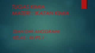 Dokumen ini menjelaskan tentang ikatan kimia yang terjadi antar atom atau molekul, dengan tujuan untuk mencapai kestabilan melalui konfigurasi elektron yang mirip dengan gas mulia. Terdapat empat jenis ikatan kimia, yaitu ikatan ion, ikatan kovalen, ikatan kovalen koordinasi, dan ikatan logam, masing-masing memiliki mekanisme dan karakteristik tersendiri. Selain itu, dijelaskan pula tentang aturan oktet yang berperan dalam pembentukan ikatan.
