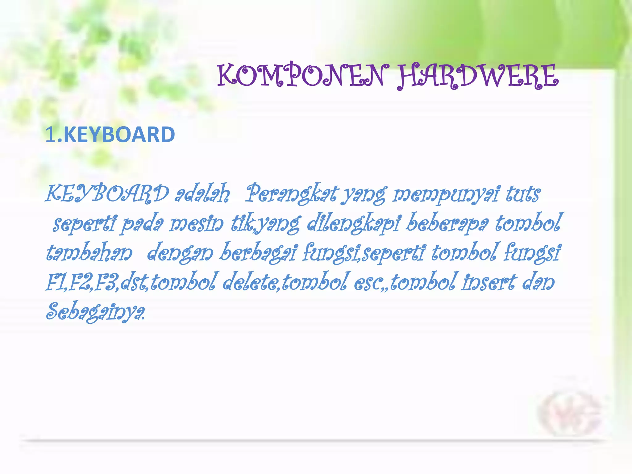 Dokumen ini menjelaskan komponen hardware dan software komputer, termasuk perangkat input seperti keyboard dan mouse, serta perangkat output seperti monitor dan speaker. Selain itu, dijelaskan juga berbagai jenis software seperti sistem operasi, program aplikasi, dan bahasa komputer. Informasi ini berguna untuk memahami fungsi serta peran masing-masing komponen dalam sistem komputer.